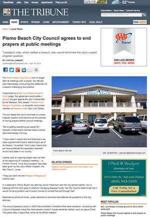 The FFRF, with the help of AUSLO, brought a successful lawsuit in 2014 against the Pismo Beach City Council, resulting in the council disbanding the office of the Pismo Beach City Chaplain and ending council-sponsored prayers and religious invocations at council meetings.